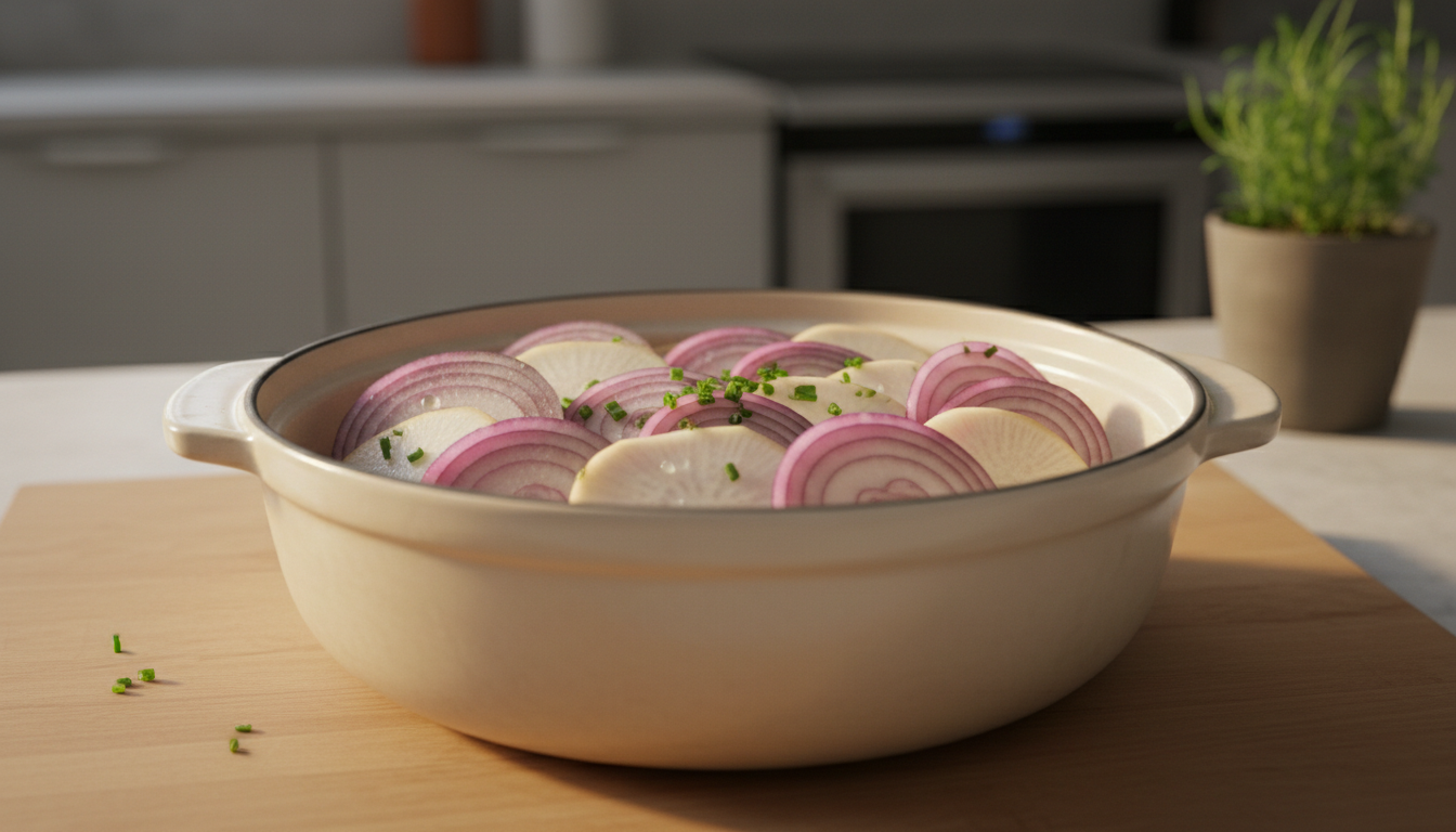 무는 약 1cm 두께로 썰어 냄비 바닥에 평평하게 깔아주세요. 두께가 너무 얇으면 조리 중 흐물흐물해지고, 너무 두꺼우면 속까지 잘 익지 않습니다. 무 위에 갈치를 얹고 양념을 부어서 조리하면 무가 자연스럽게 국물을 흡수하며 깊은 맛을 만들어냅니다. ✅