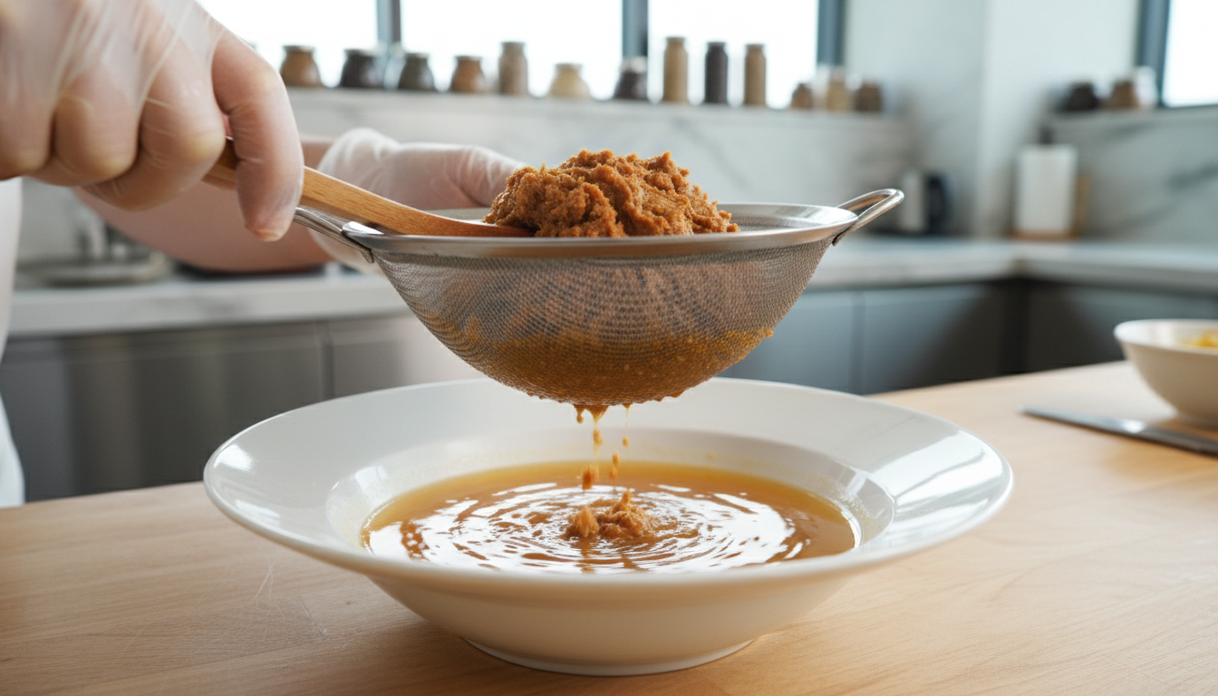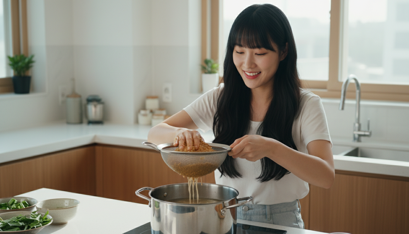 준비한 육수가 끓기 시작하면 된장을 체에 걸러 곱게 풀어줍니다. 덩어리가 남으면 식감이 좋지 않으니, 작은 체나 숟가락 뒷면으로 꼼꼼하게 풀어주세요. 된장의 양은 1큰술 정도로 시작해서, 끓인 뒤 간을 보며 추가하는 방식이 실패 없는 방법이에요.