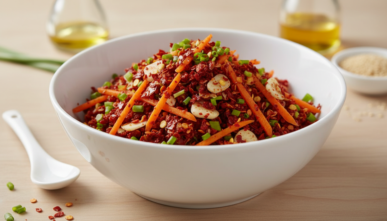 부추는 깨끗이 씻어 3~4cm 길이로 썰고, 당근은 곱게 채 썰어 준비합니다. 볼에 고춧가루, 다진 마늘, 새우젓, 설탕(또는 매실액), 생강즙을 넣고 먼저 섞어줍니다.