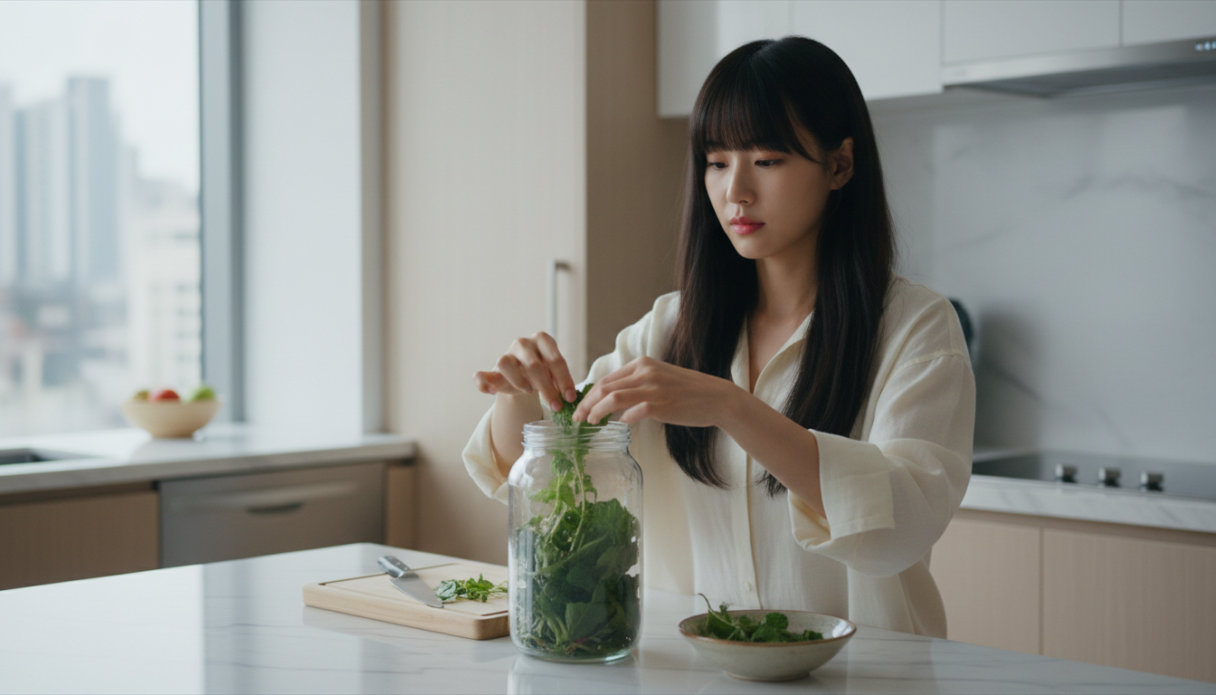 가능은 하지만 명이나물 장아찌 황금레시피의 핵심은 생잎의 아삭한 식감과 향에 있습니다. 데치면 향이 많이 날아가고 식감도 물러져 장아찌 특유의 매력이 줄어들어요. 생잎 그대로 소금에 살짝 절여서 담그는 방식이 가장 맛있는 결과를 줍니다.