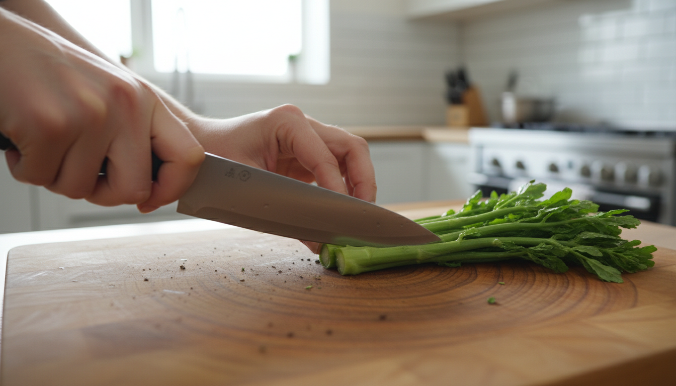 밑동의 딱딱한 부분은 칼로 조금 잘라냅니다. 두꺼운 밑동은 칼집을 살짝 넣어두면 데칠 때 열이 고루 전달되어 식감이 훨씬 부드럽게 나옵니다.